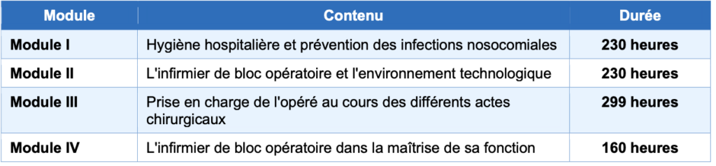 La formation est structurée en 5 blocs de compétences et 12 unités d’enseignement, conformément à l’arrêté du 27 avril 2022 relatif à la formation conduisant au diplôme d’État d’infirmier de bloc opératoire.